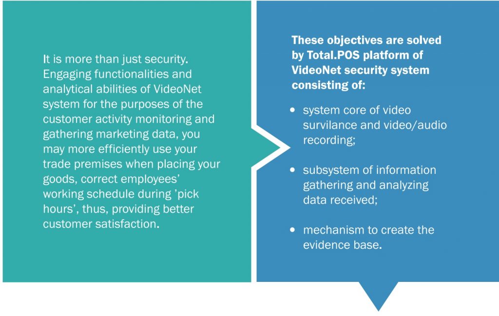 Setting a safe enviroment to customers and personnel, as well as thefts and robberies prevention are a major problems of any owner of retail business facilities of any size. Video survailence system installation in critical areas, such as point of sales, warehouses, parking lots, application of video analytics and integration of access control systems and security and fire alarm systems can efficiently solve these problems and reduce commercial losses.